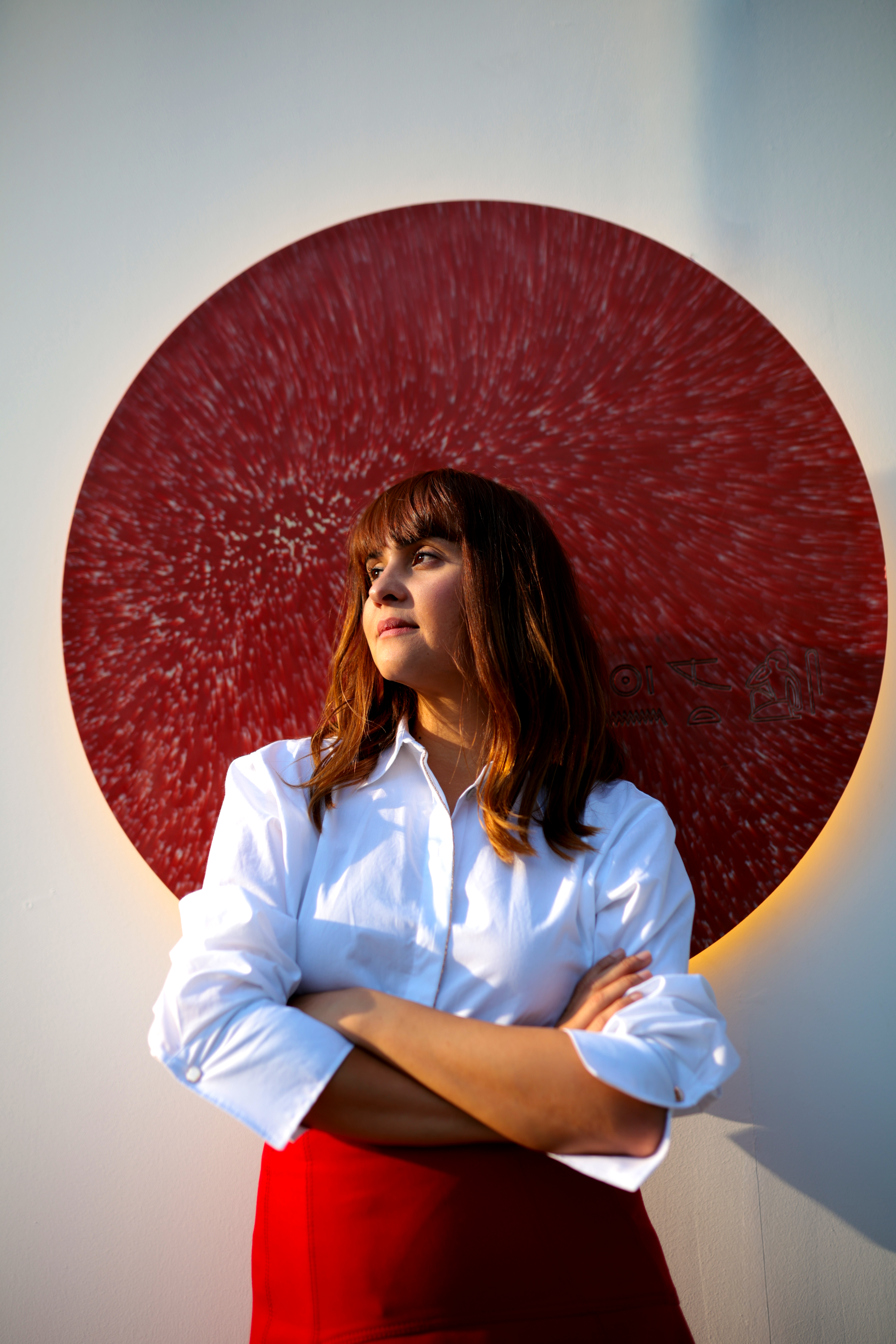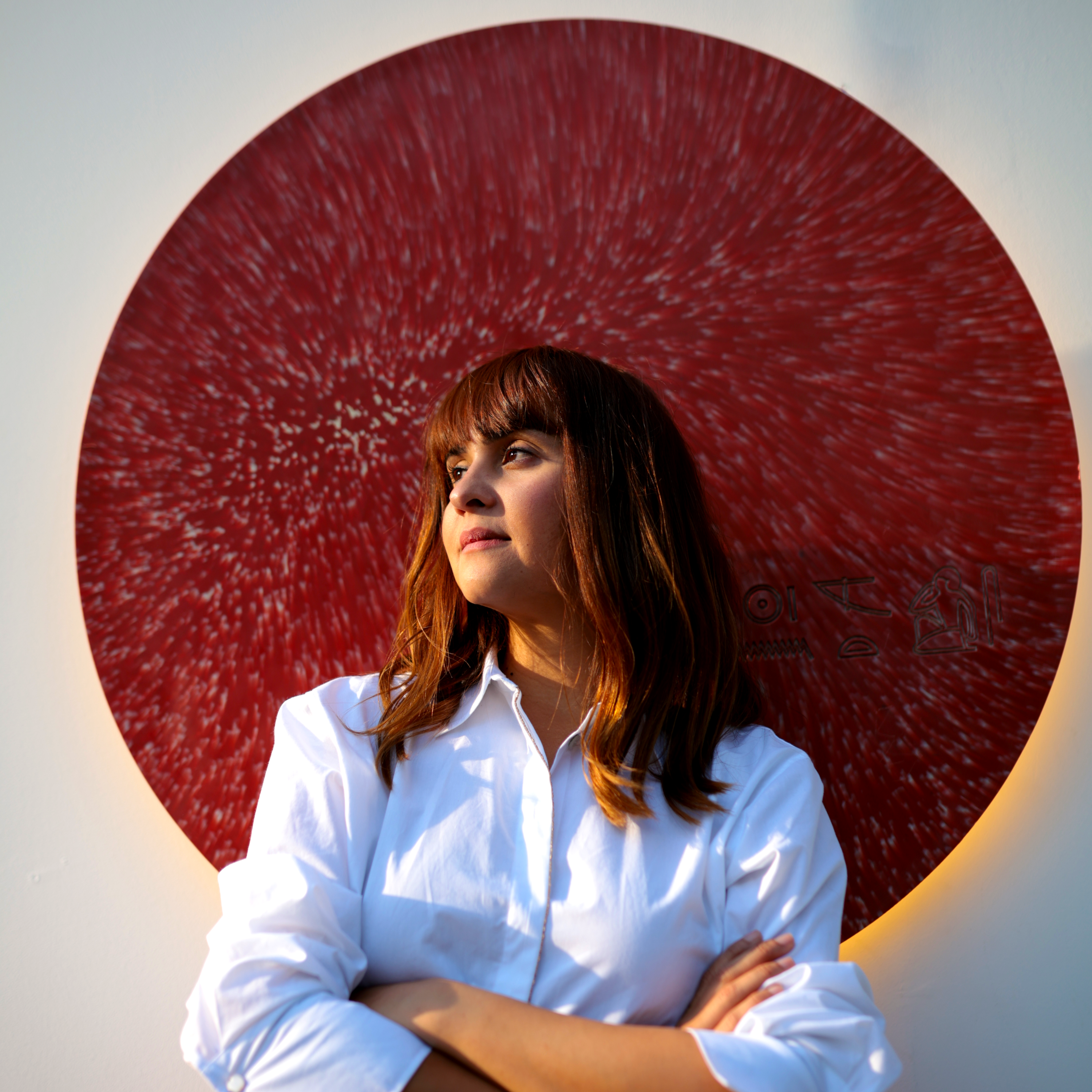 Designer Shosha Kamal brings this tenderness into the present through a series of circular wall lamps made from Mai-t’s recycled plastic sheets. The circle — the oldest symbol of eternity — becomes her canvas. Engraved with the same hieroglyphs found in the temple, each lamp glows in warm, sun-born hues.