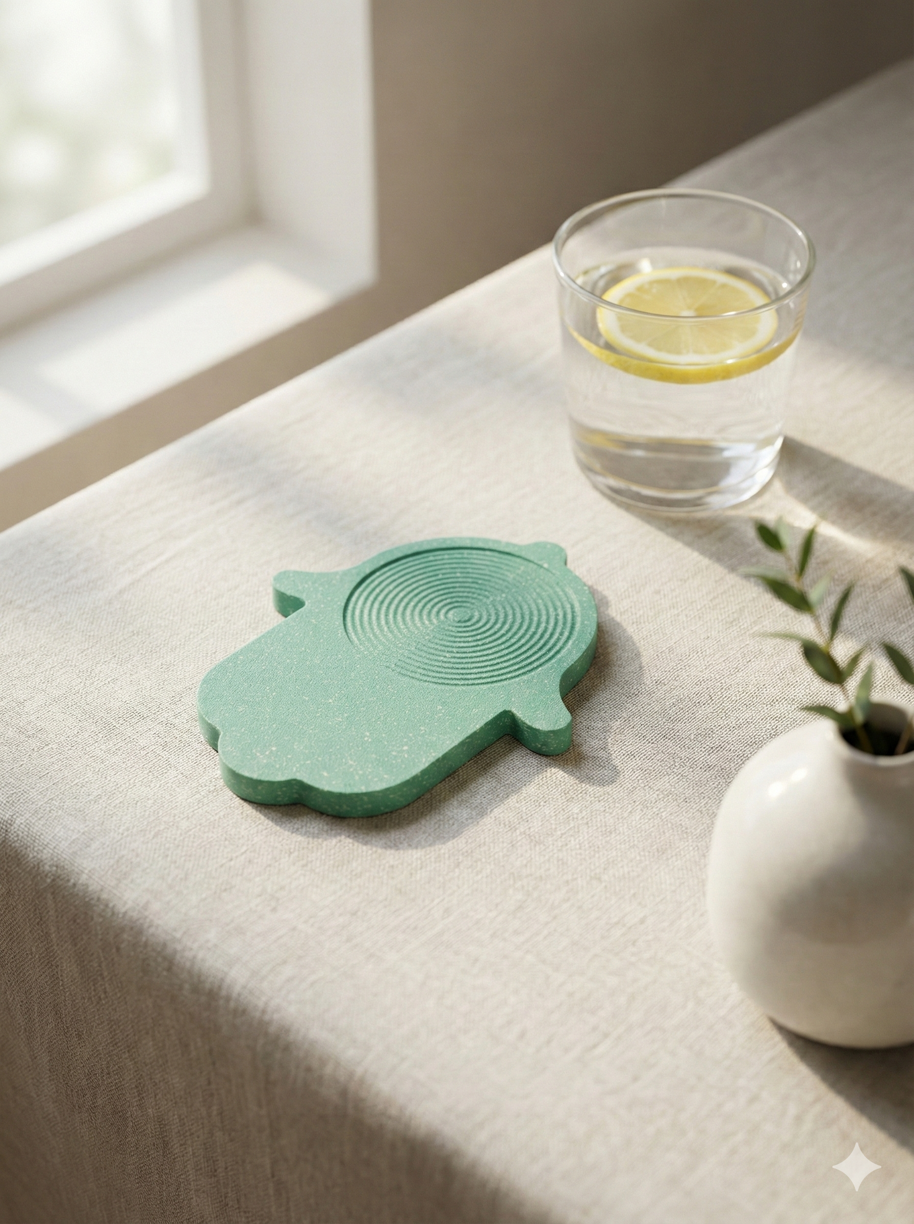 The coasters take the Khamsa out of ritual and7*y*^ľ) into daily life, turning a symbol of guidance into something you hold, gift, or leave on your table.